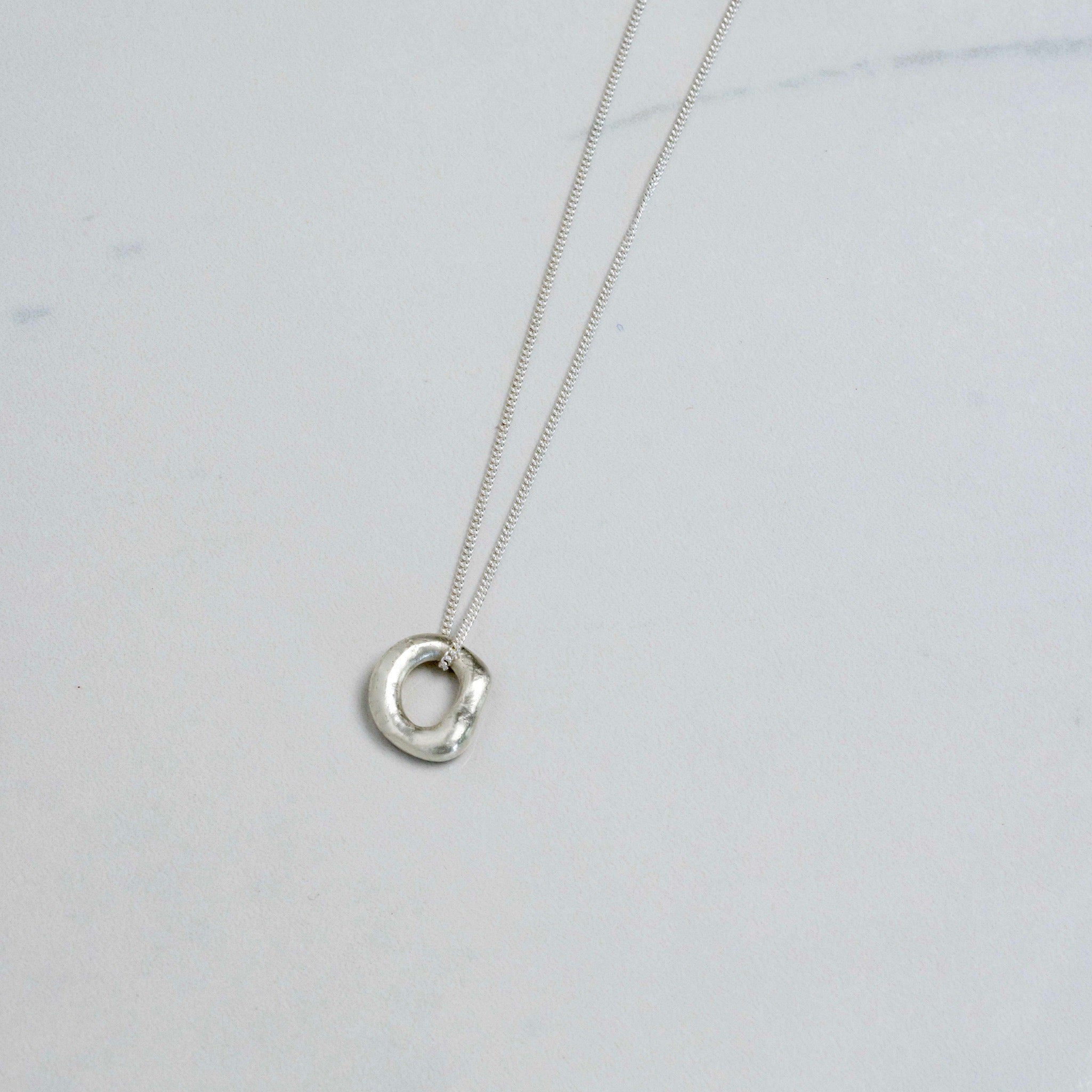 Freely formed solid silver O nugget with a satisfying weight and tactile surface hangs from a silver curb chain.