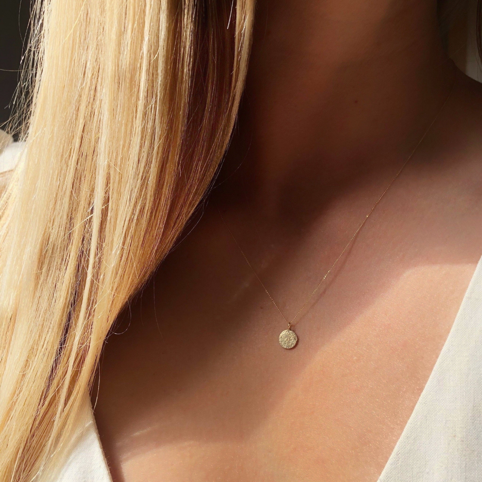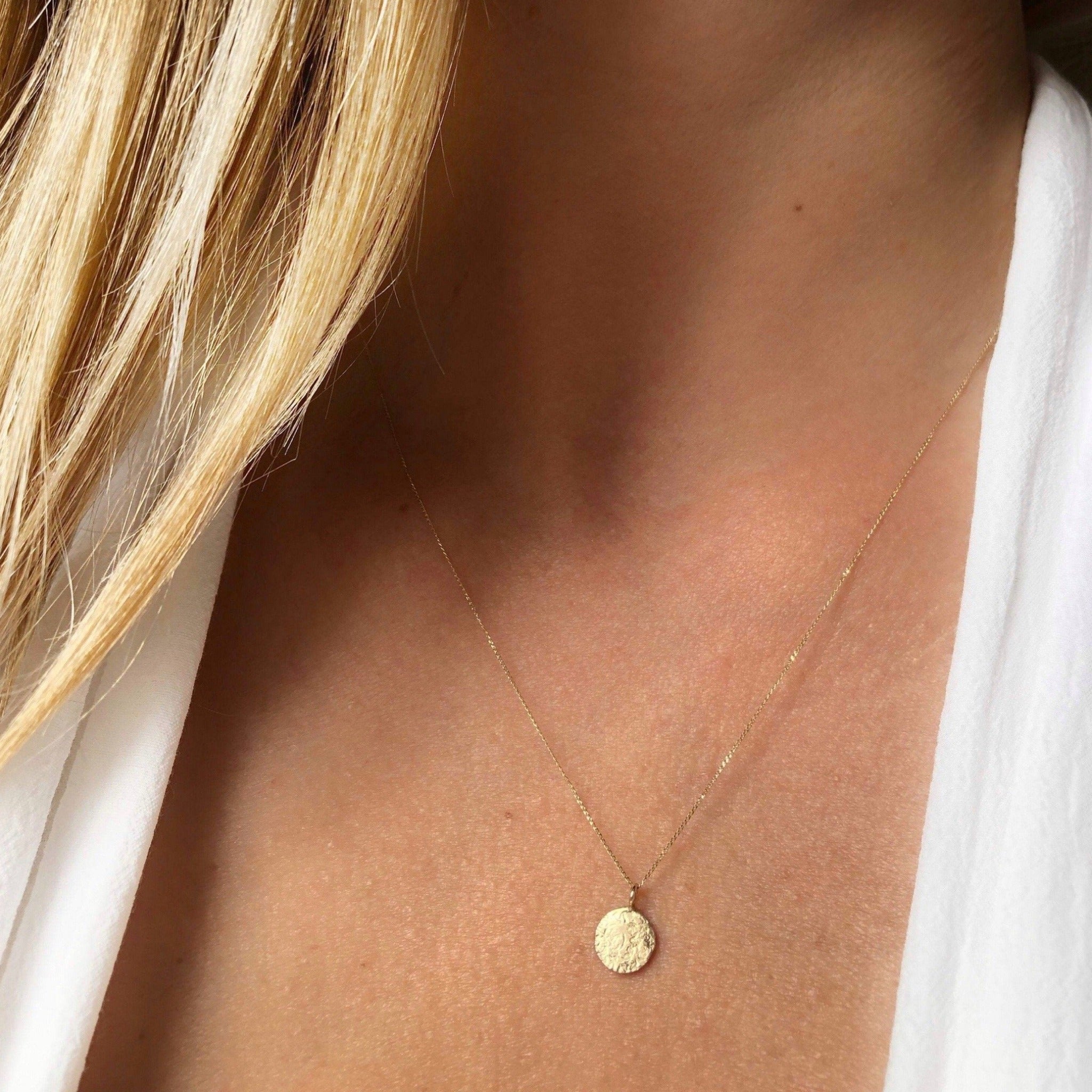 The 9ct gold disc necklace is a beautifully delicate necklace that looks great worn alone or layered up with others.