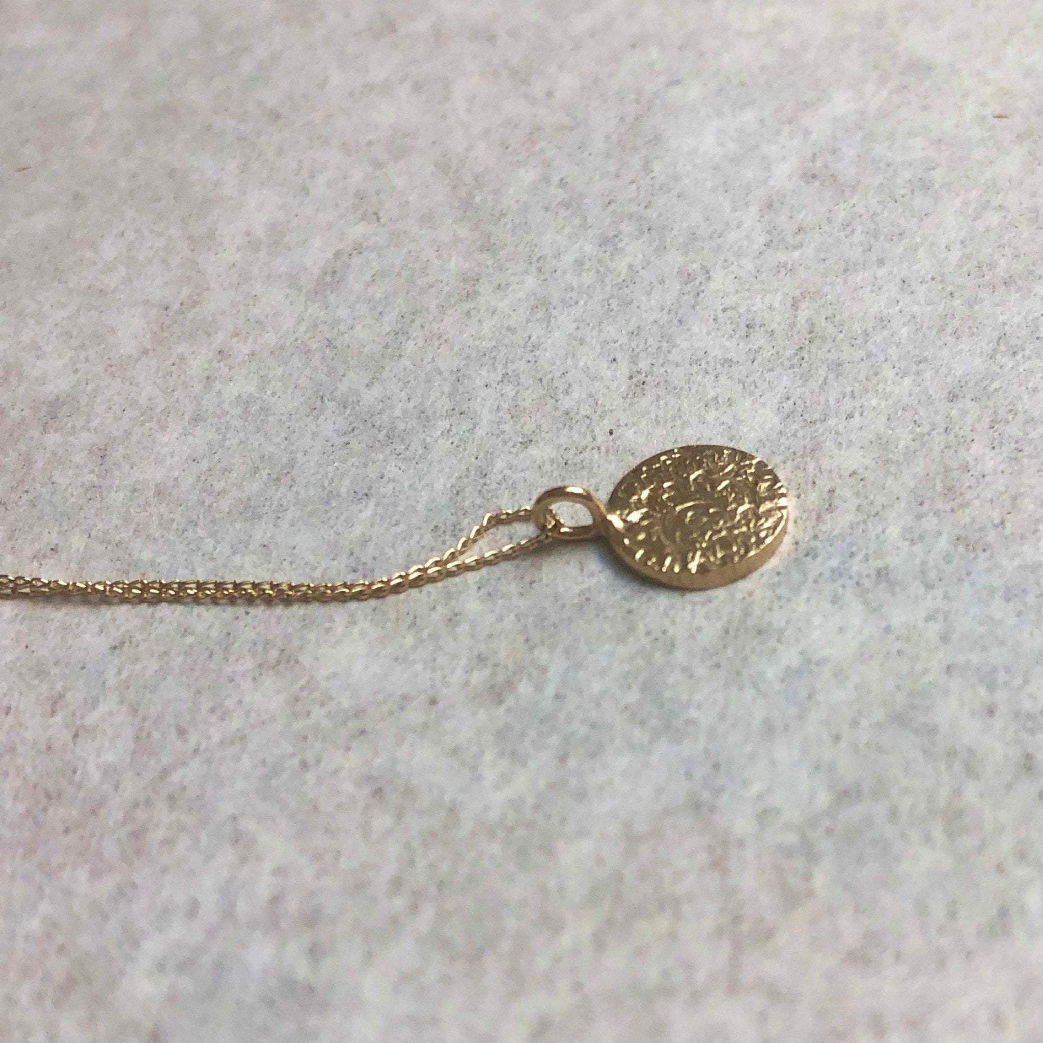 The 9 carat gold disc pendant has been given a subtle repeat sun design that adds interest and depth - added by hand so that no two are ever exactly the same. The pendant hangs from an elegant diamond cut 9 carat gold chain (shown on an 18" chain).