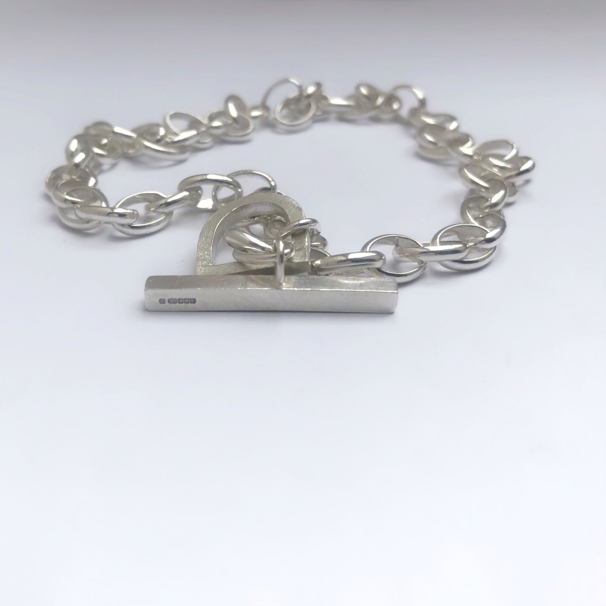 A chunky linked chain is secured in place with a feature D shape fastening and squared hallmarked toggle which can be worn on show at the front or at the back of your neck. A statement piece for sure which looks equally at home worn alone or stacked alongside other chains.