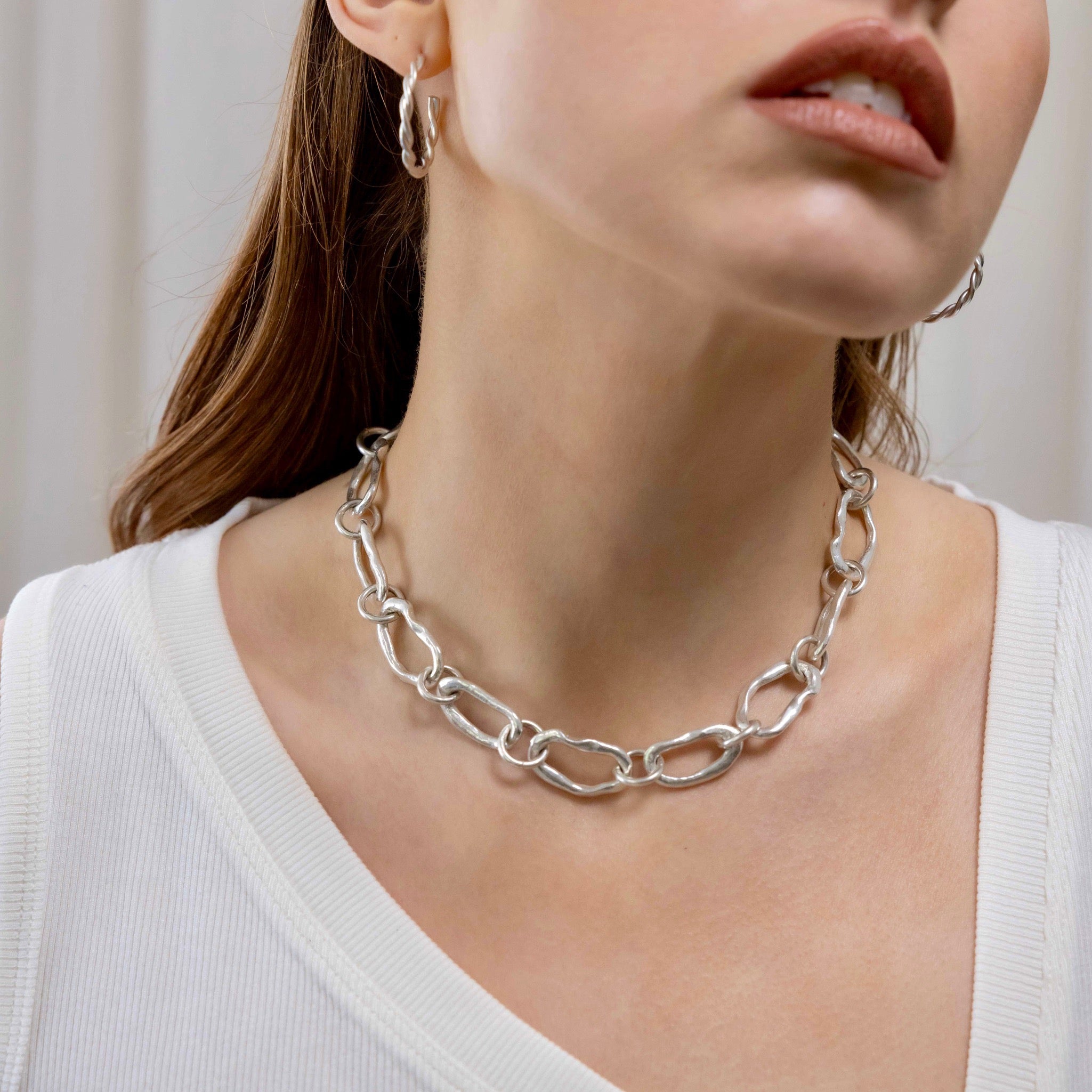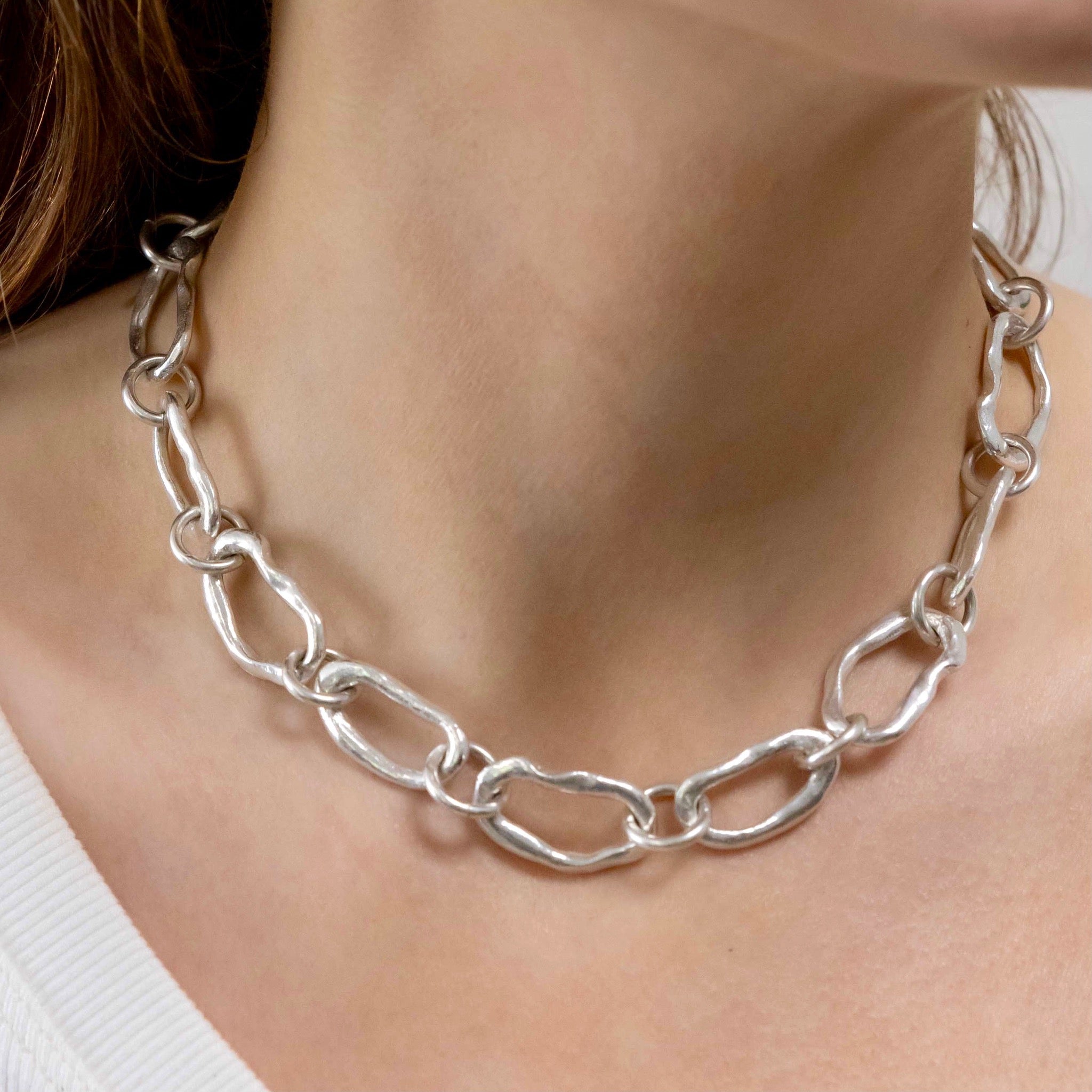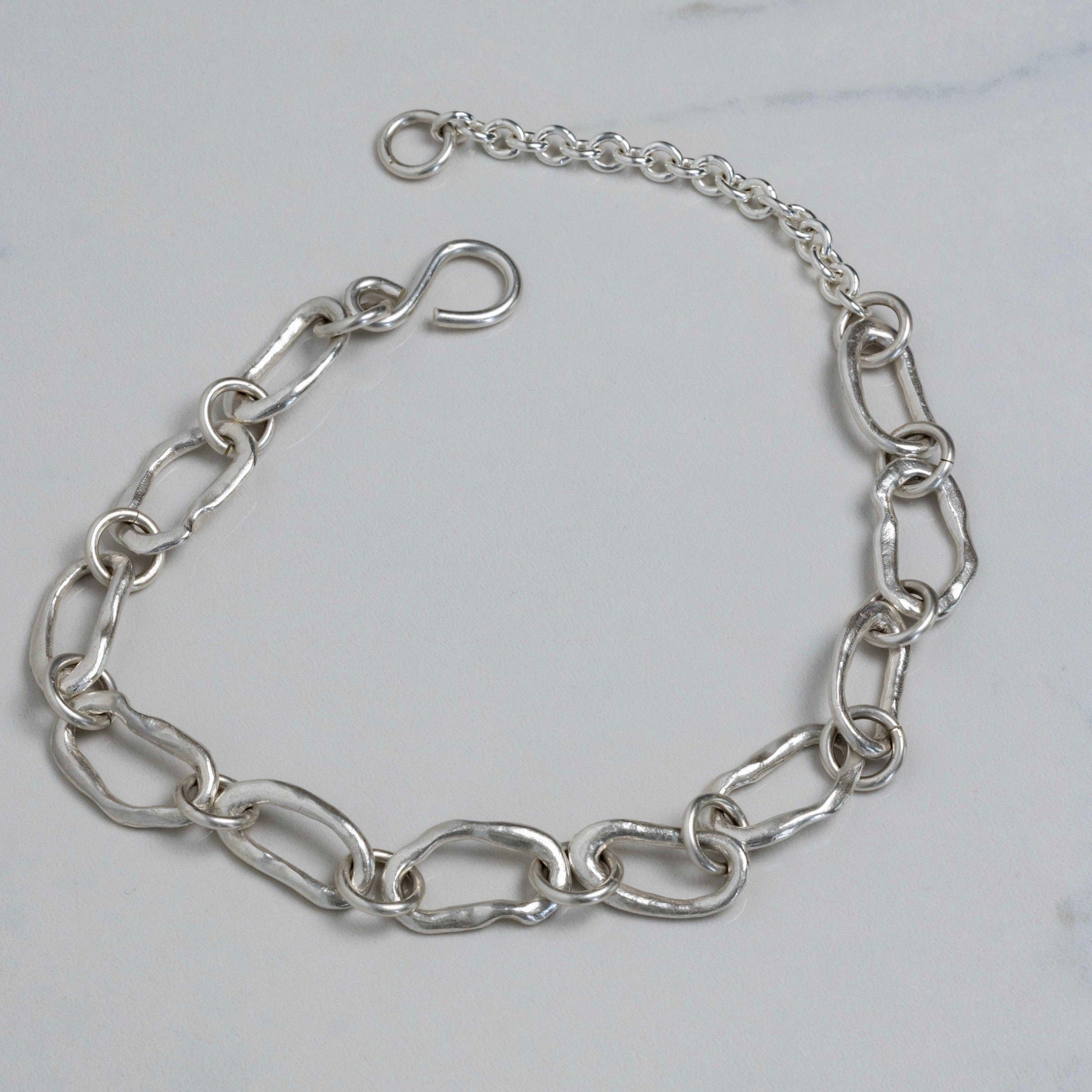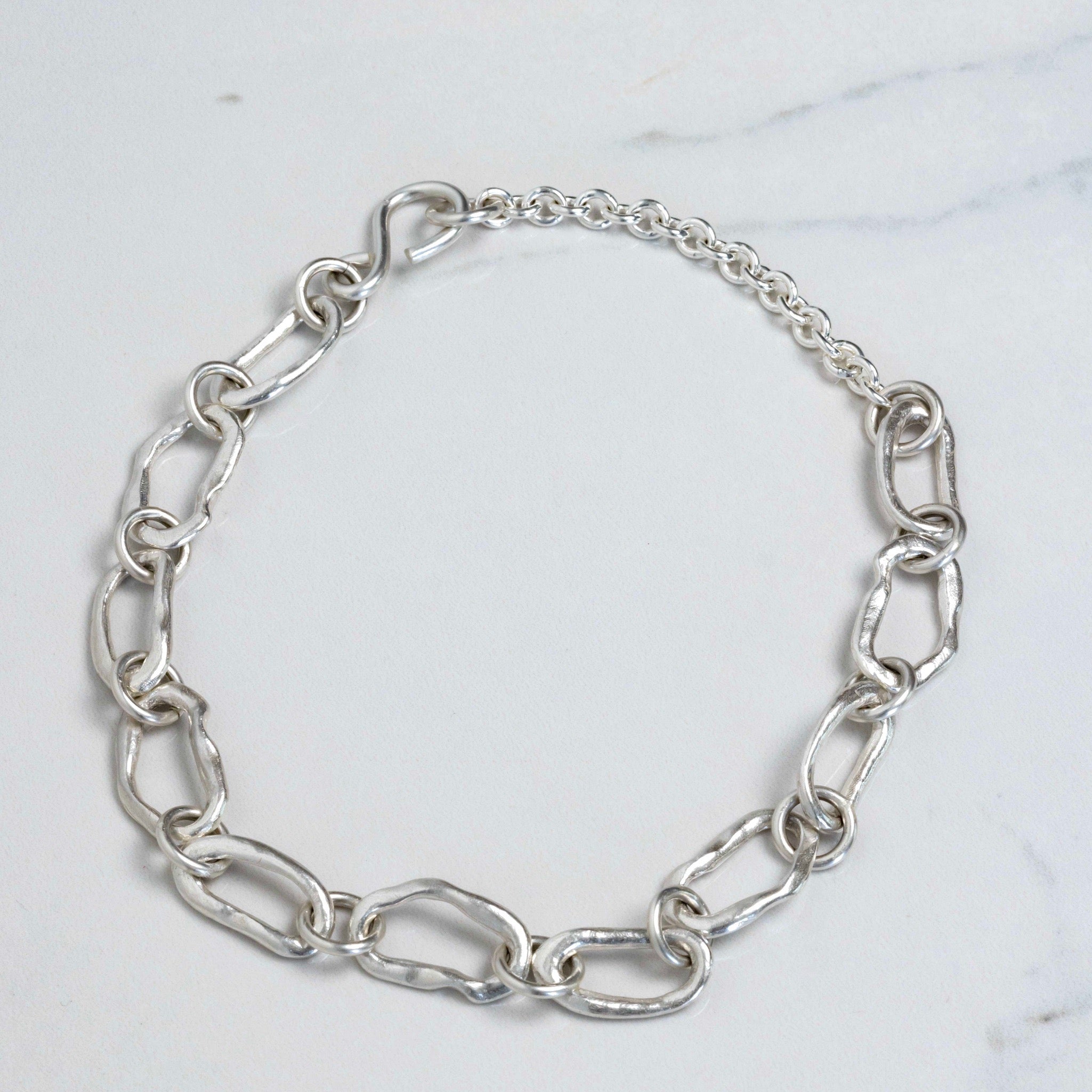 Links are individually created by melting silver to coax into beautiful organic Os, which are then linked with sturdy circular links before being brought together with the handcrafted S link.