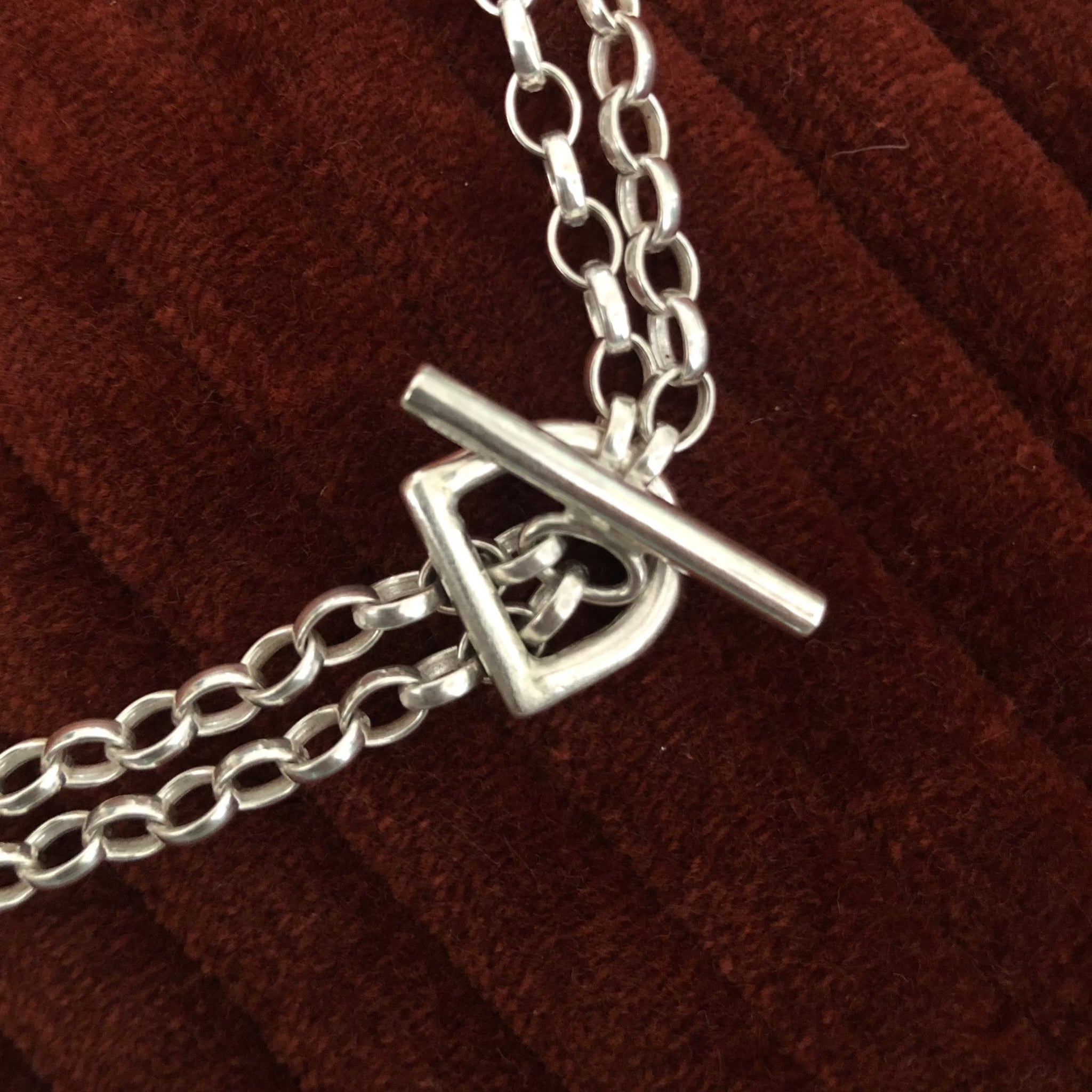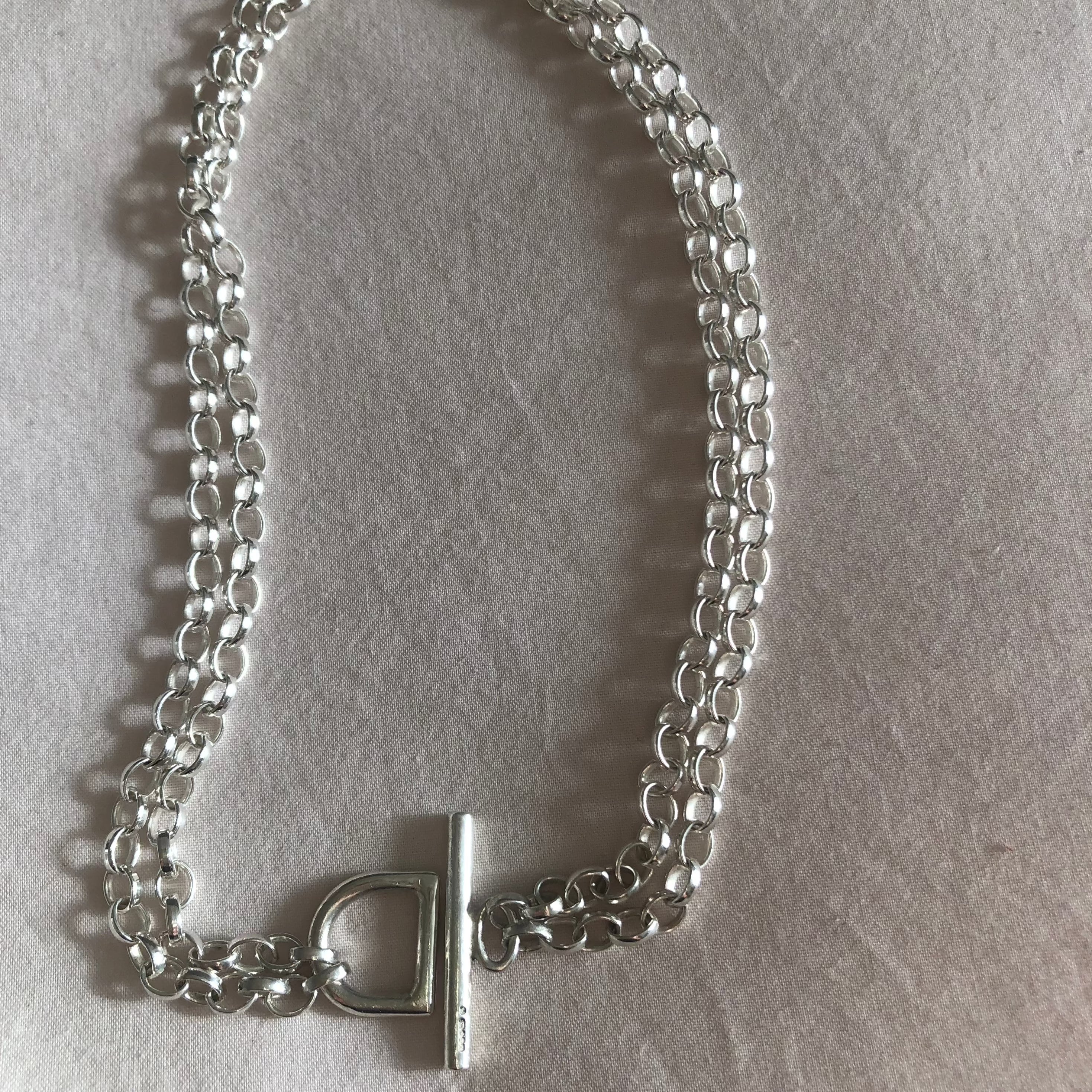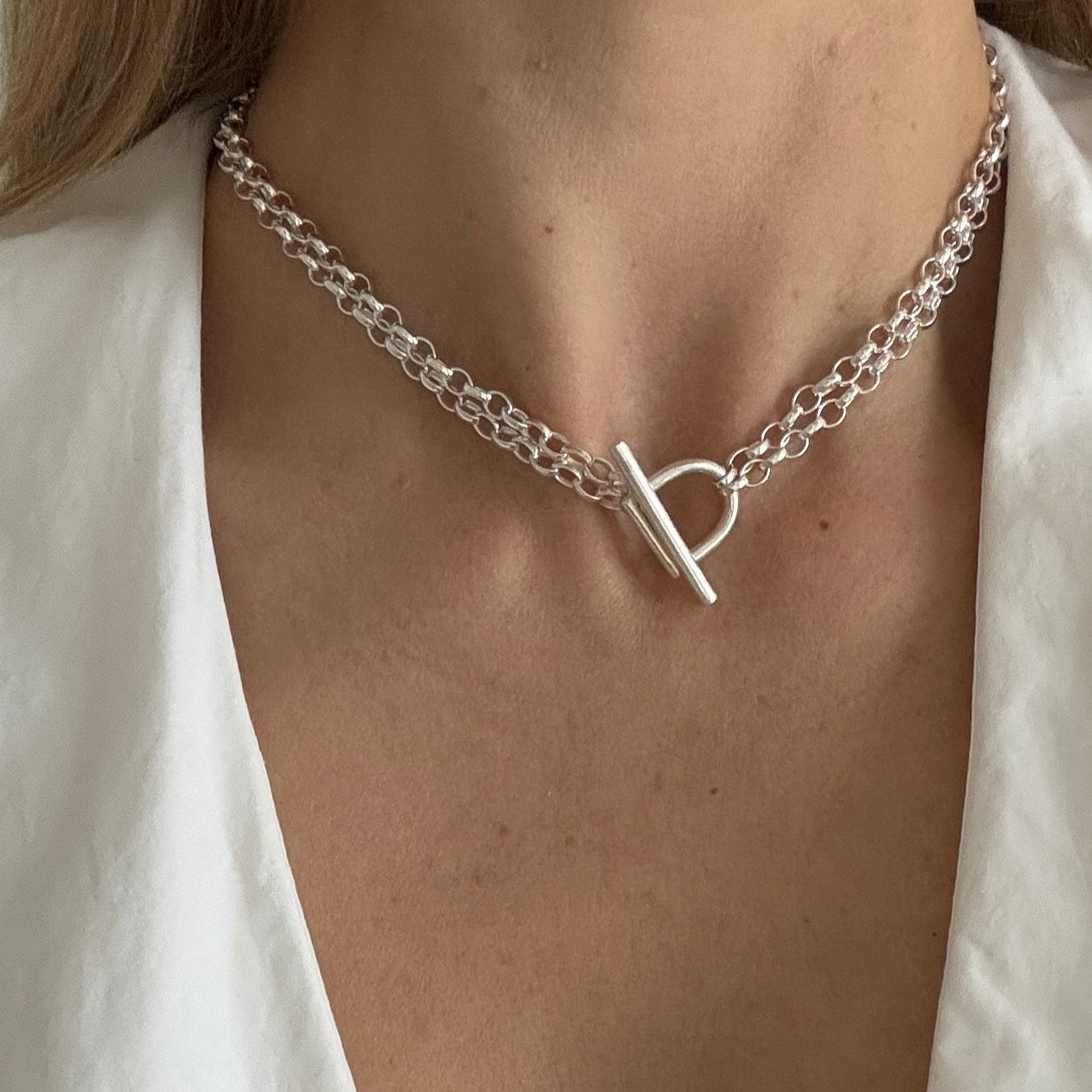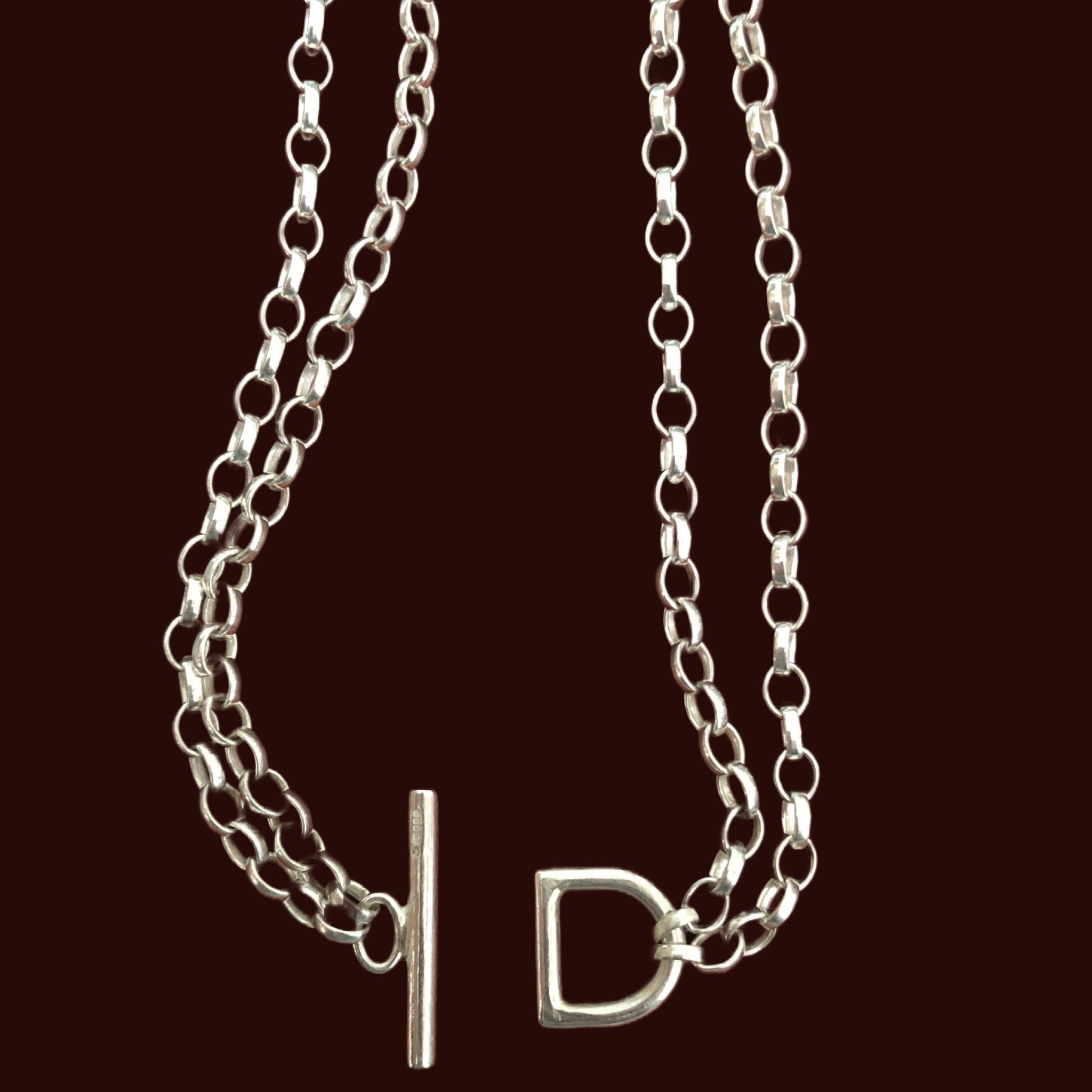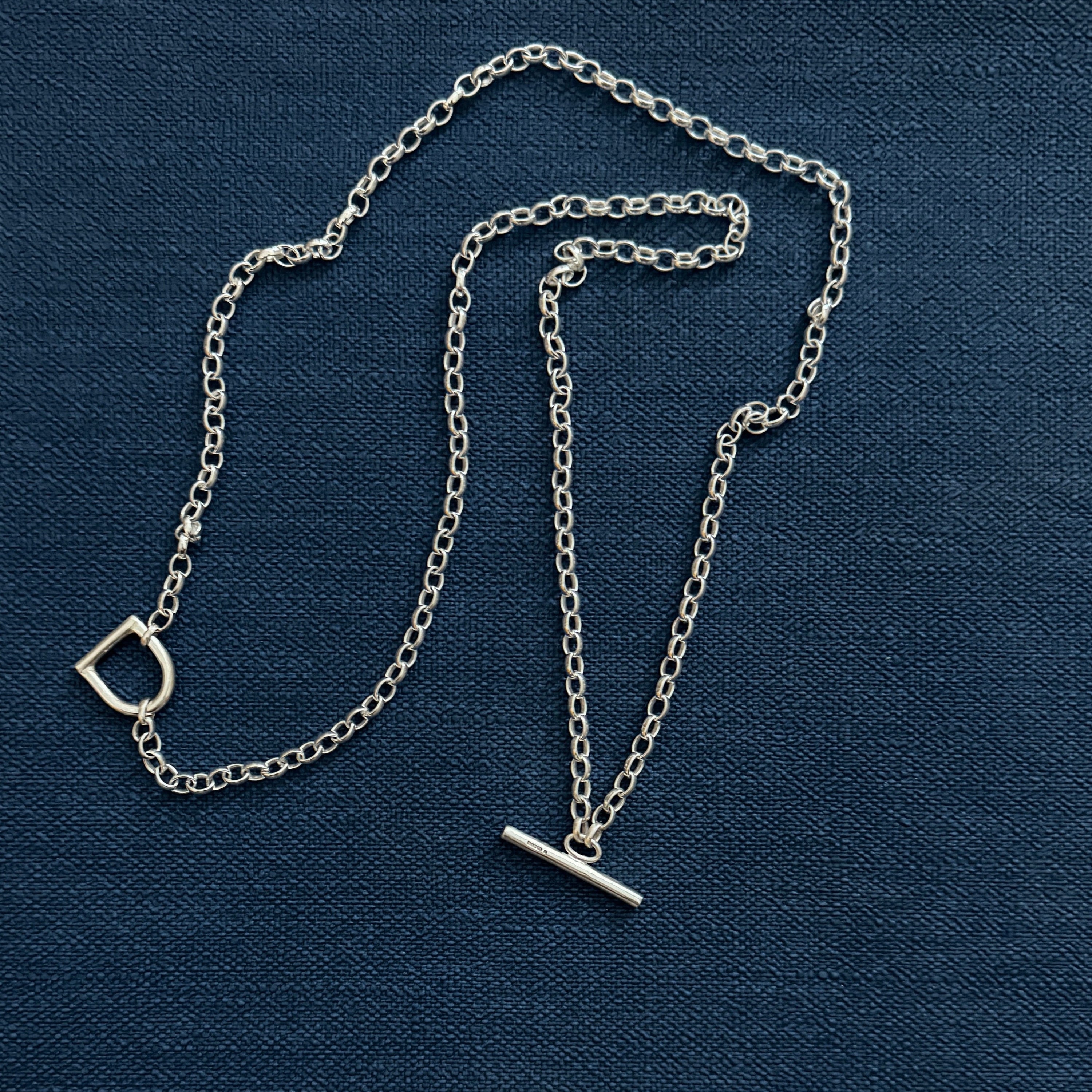A versatile necklace, the Gill can be worn short to sit on your collarbone using the D and toggle closure, or left to hang long with the D closure at the back of your neck and toggle as a pendant.