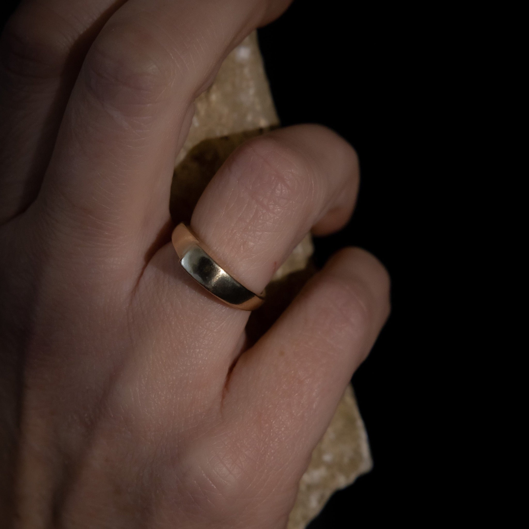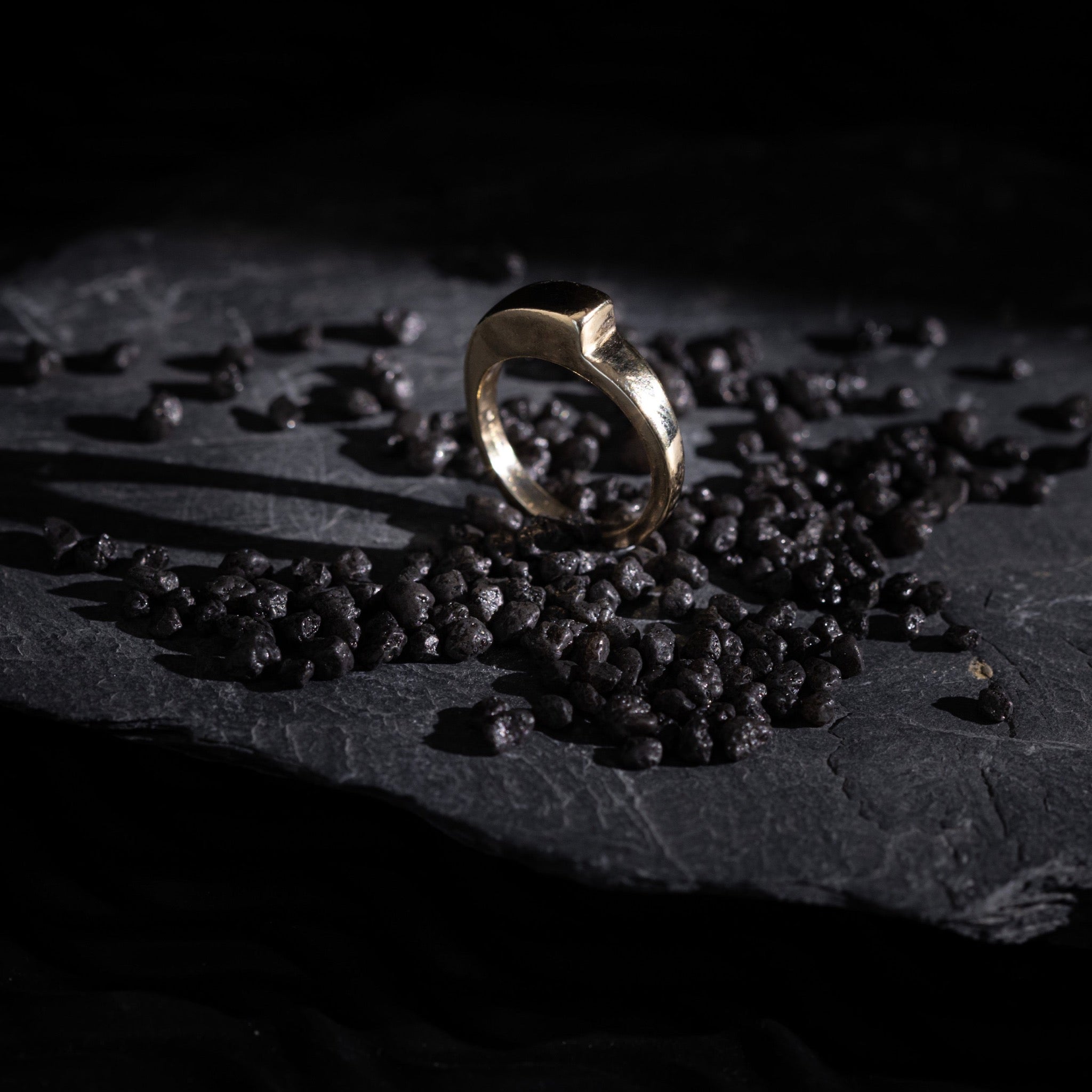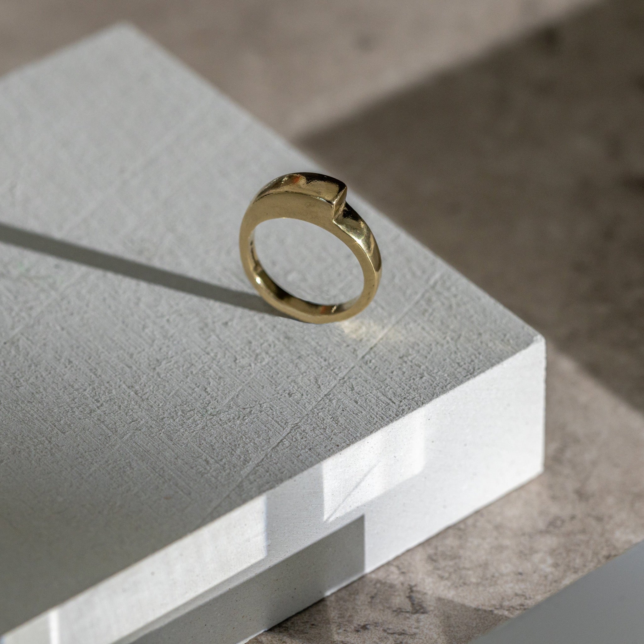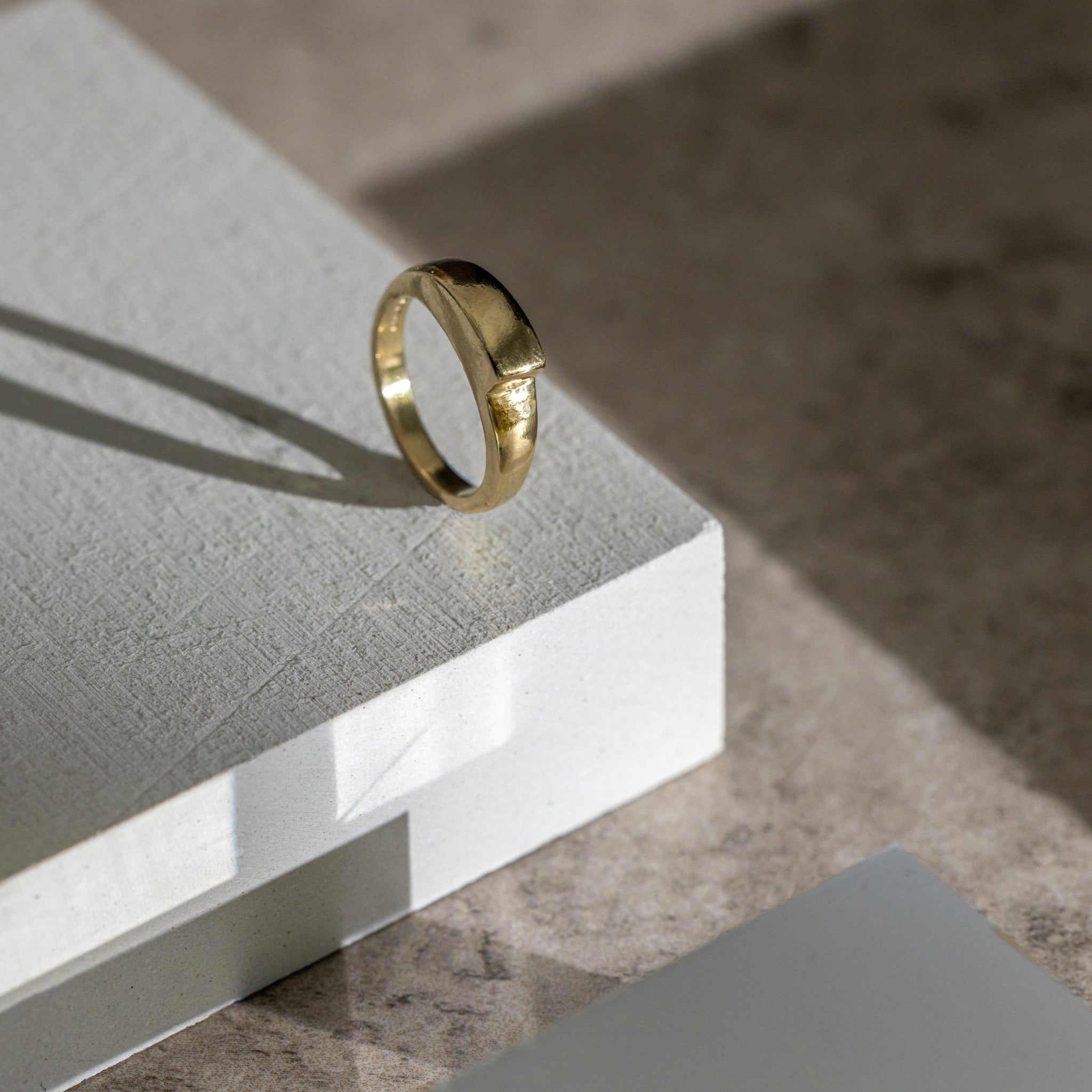 Contoured solid ring carved in wax and cast in 9ct yellow gold. Finished with a shine, this ring has a satisfying weight and beautifully complements our gemstone rings.
