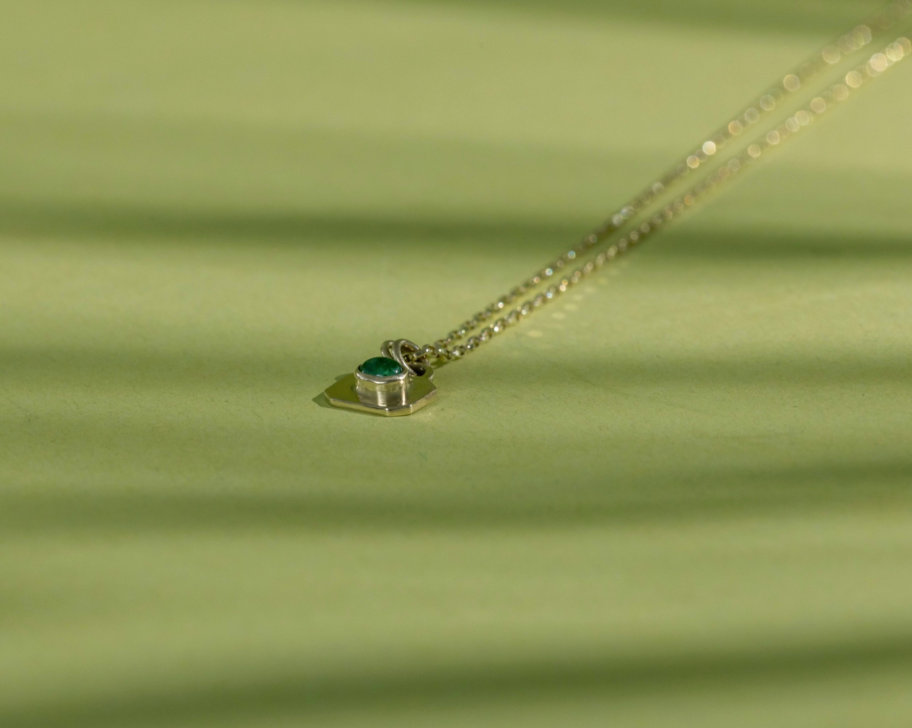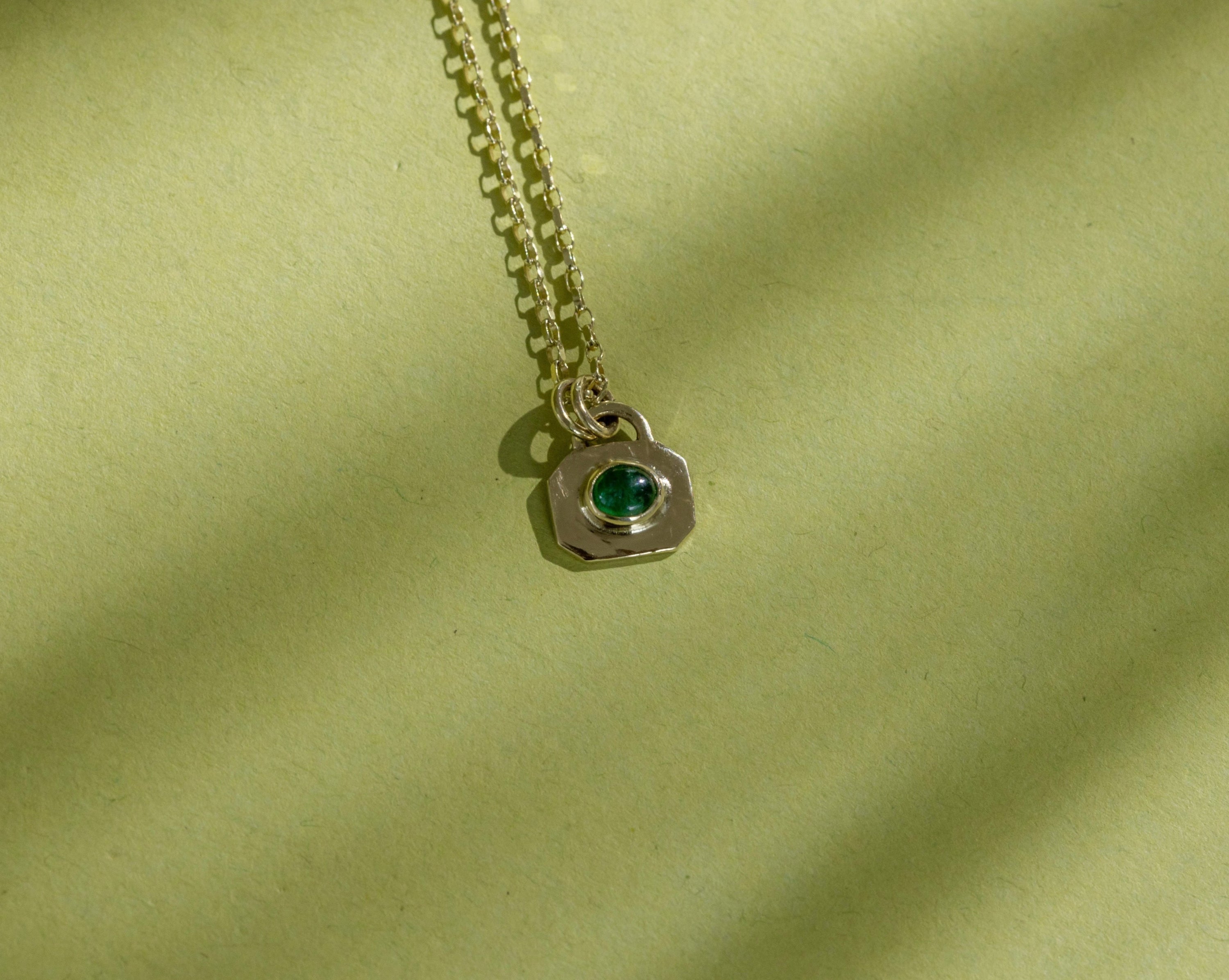 Eight sided gold slab surrounds a raised orb shaped mossy green tourmaline stone. Double loops carry the pendant onto the diamond cut chain which catches the light beautifully.