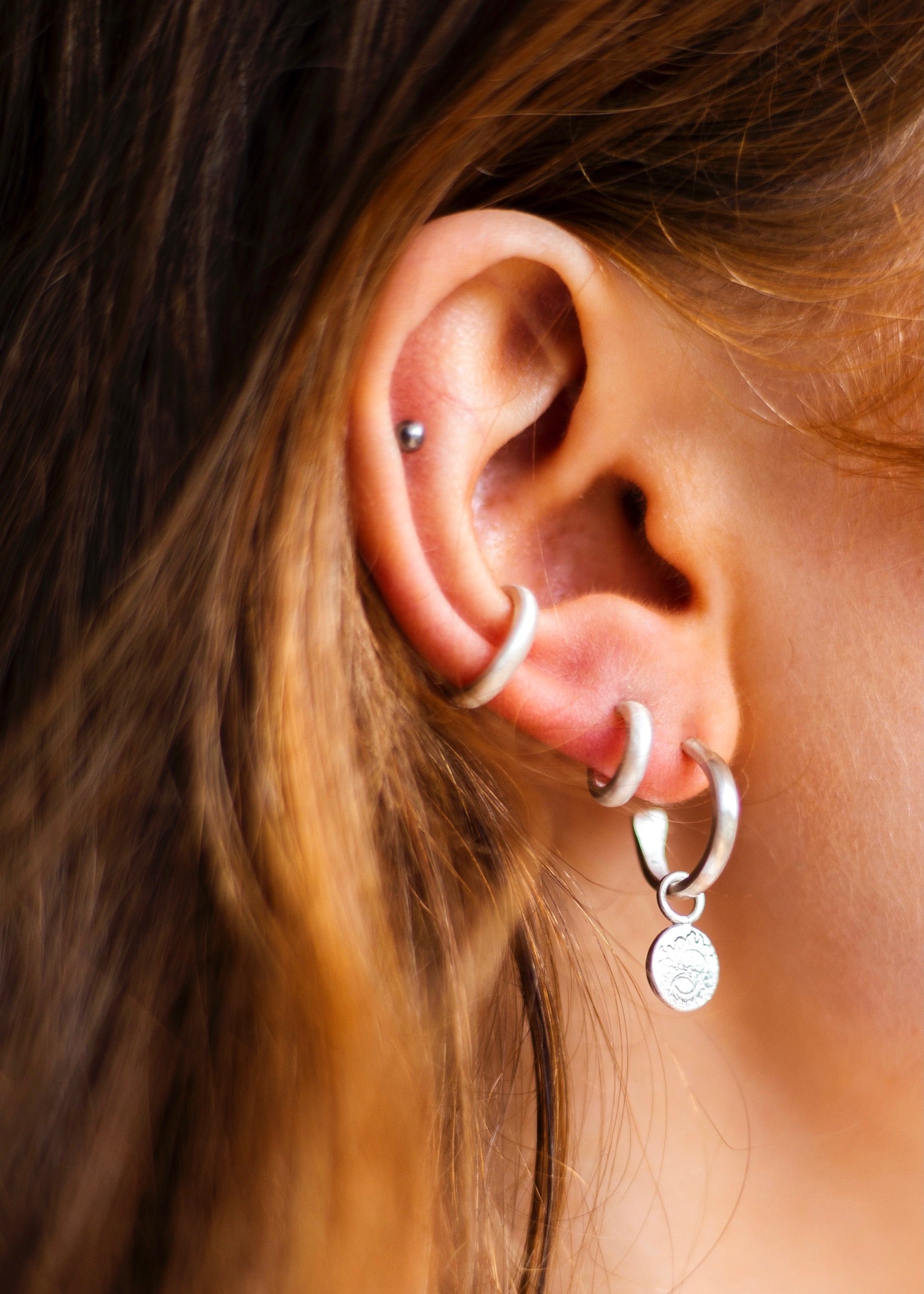 These small silver hoops have a removable silver sunburst charm, giving you two looks in one. Each hoop and charm are formed by hand and are available as singles or pairs so that you can mix and match with other charm or stacking earrings.