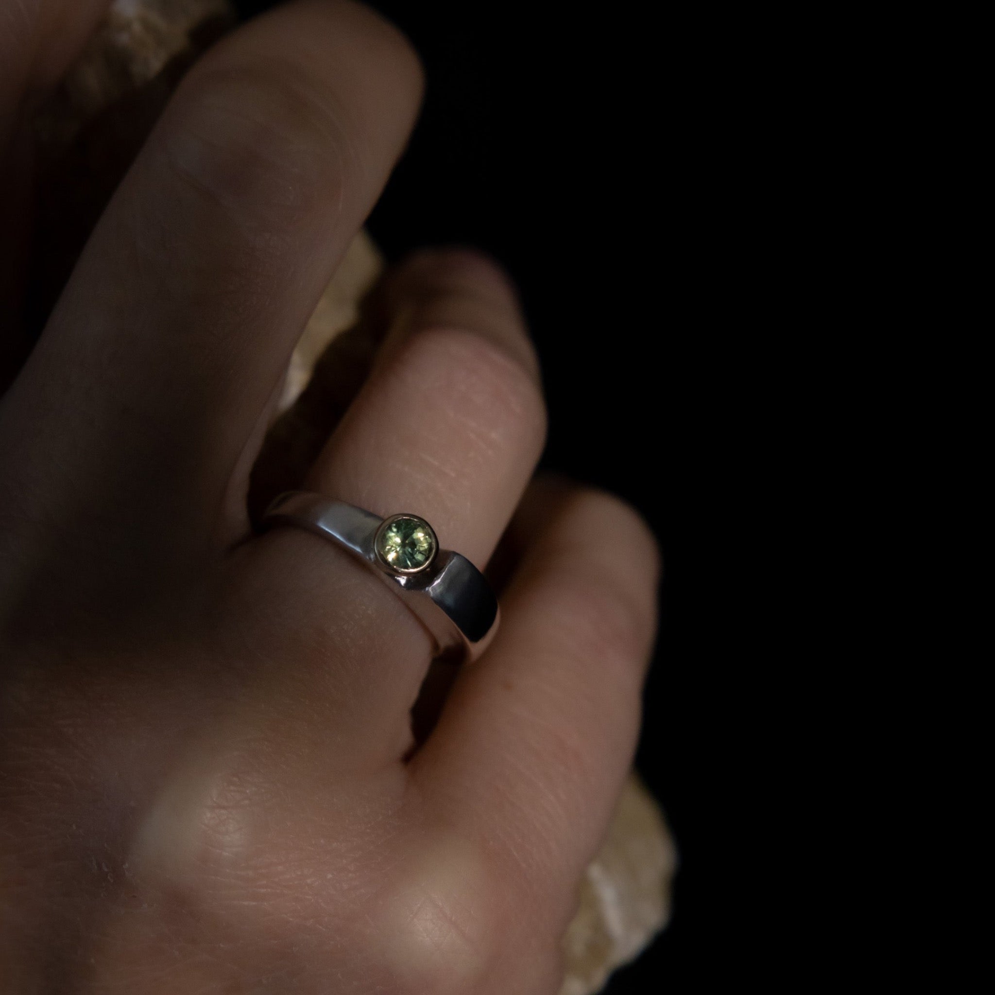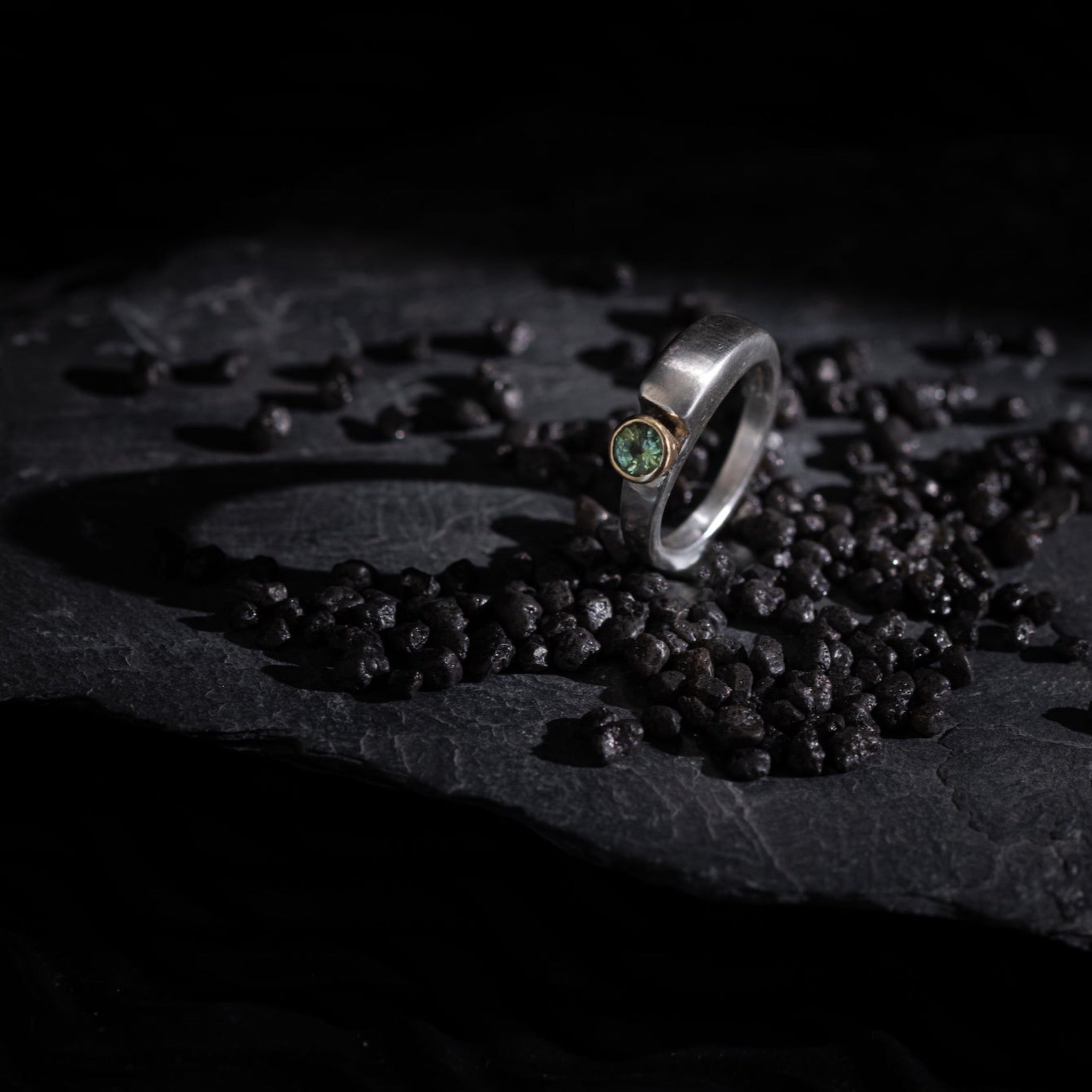 A sparking cut Australian green sapphire set in an elevated position in 9ct yellow gold on a solid contoured silver band.