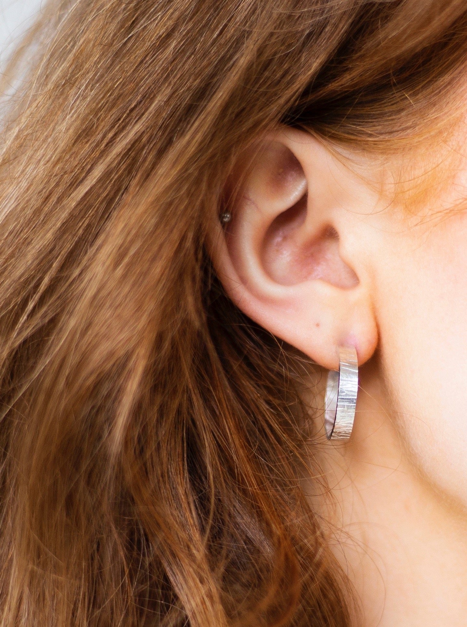 These open hoop earrings are formed by hand from recycled silver and individually scored across the surface. An everyday hoop earring with an individual twist.