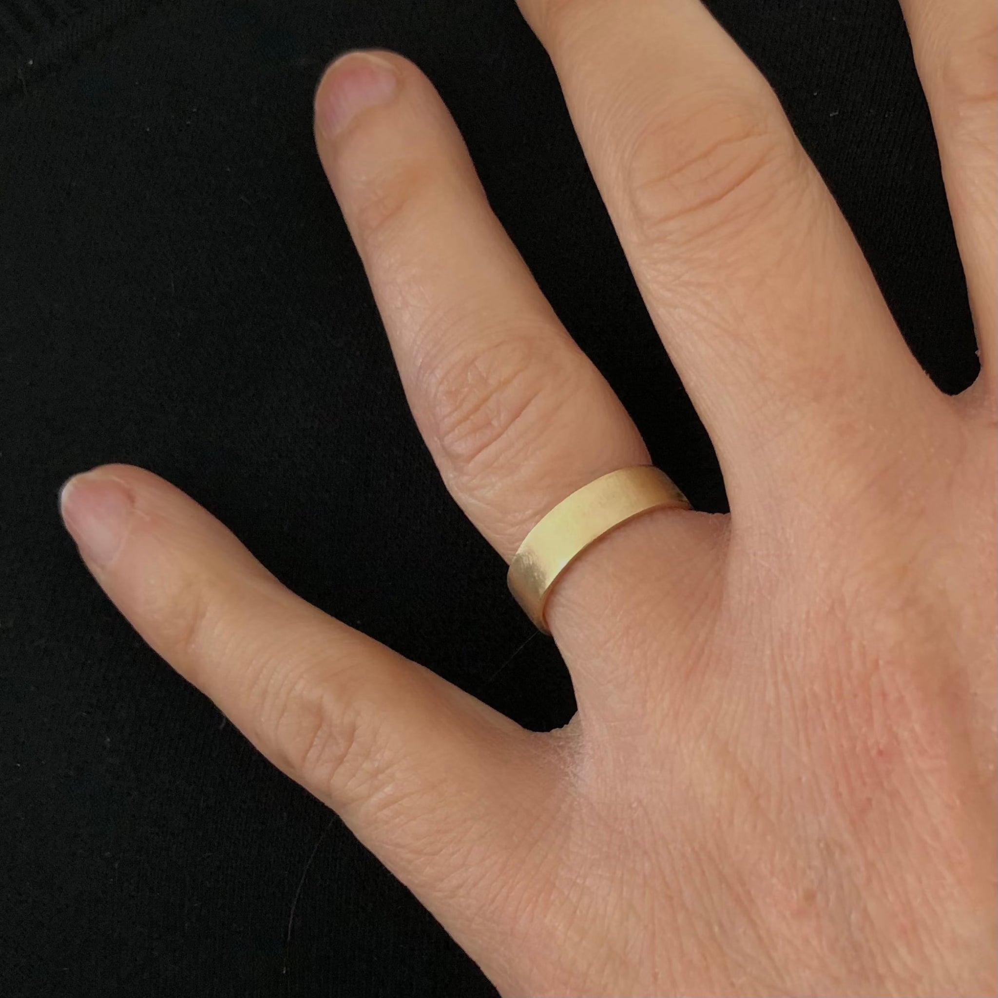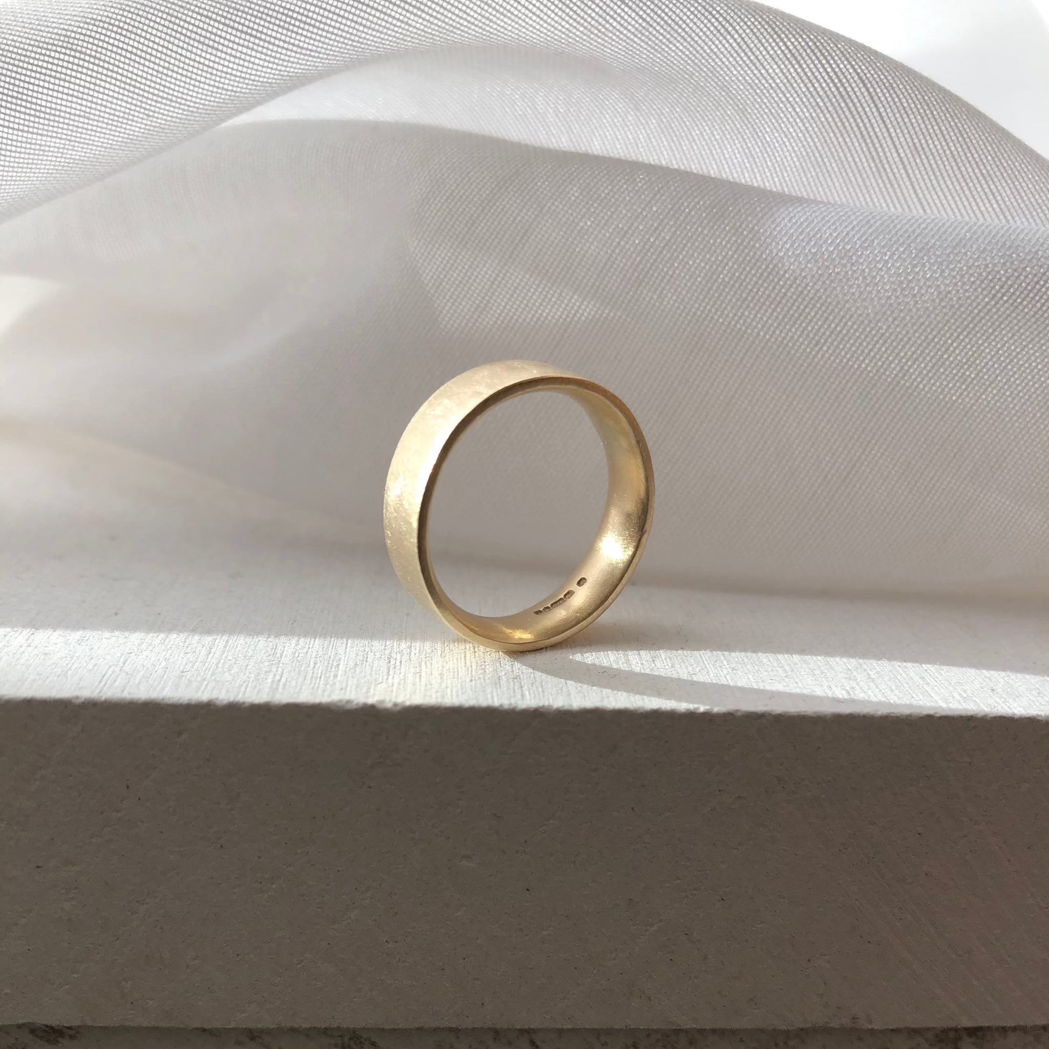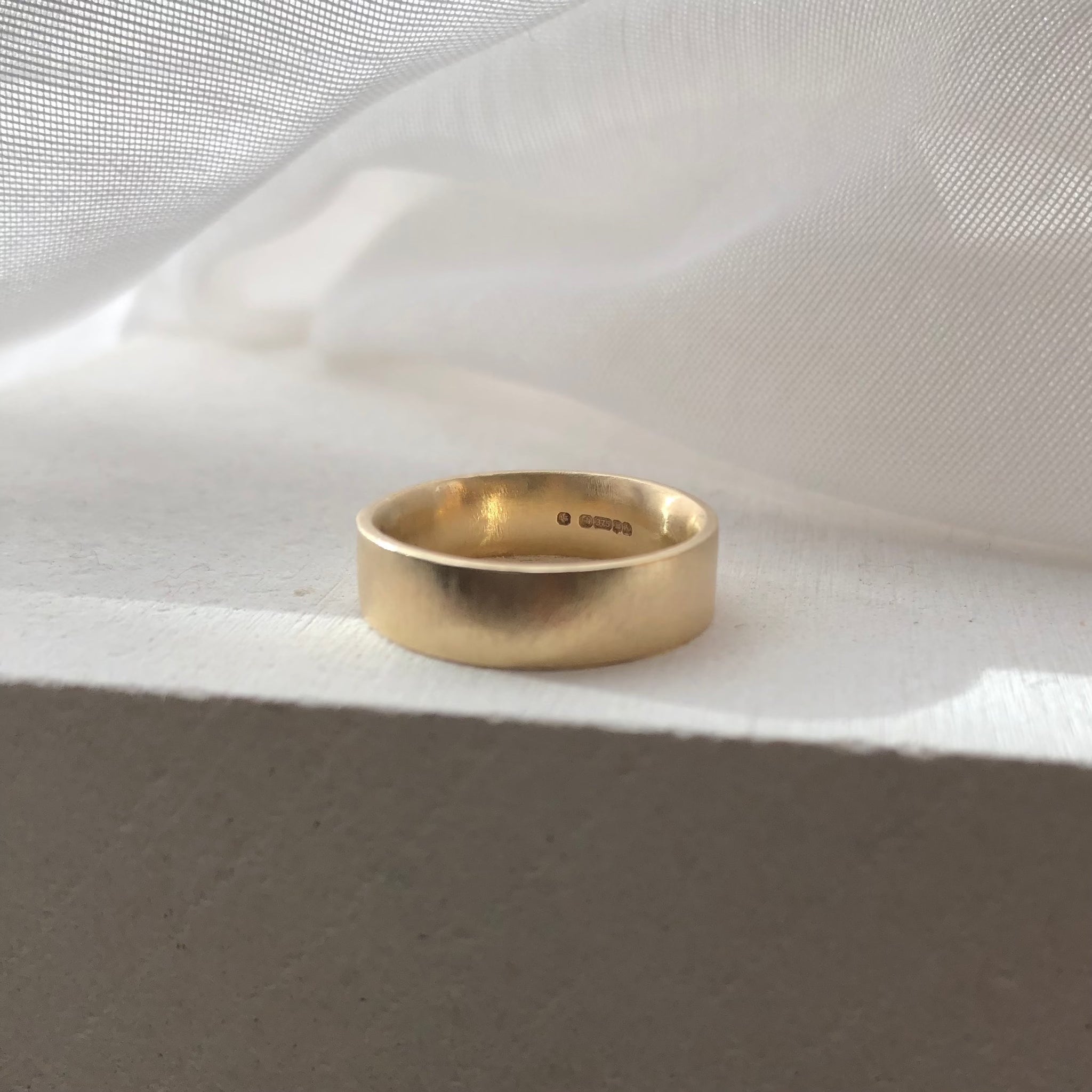 An elegant ring made in 9ct yellow gold featuring a brushed finish to the surface. Curved on the inside this is a beautifully comfortable ring to wear.