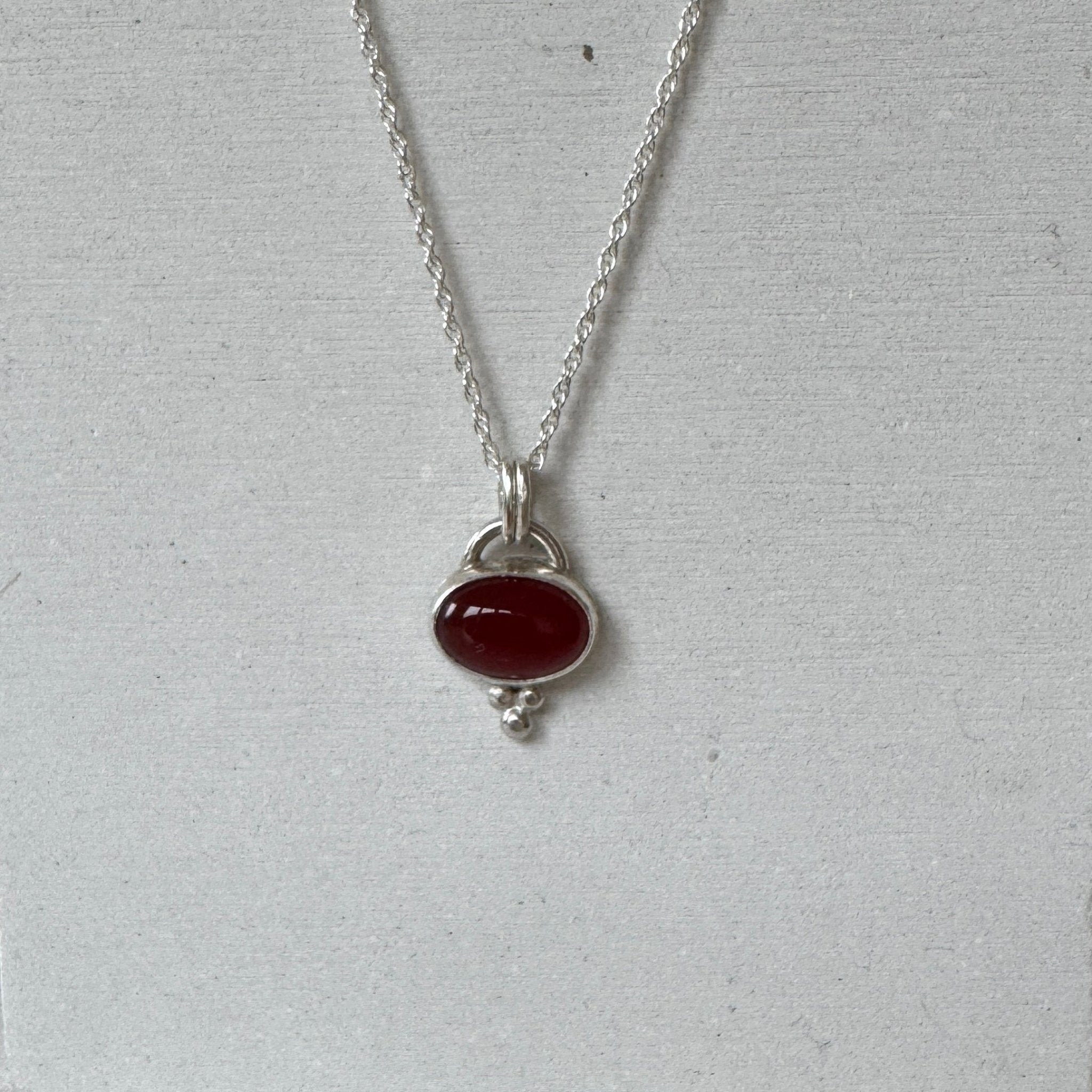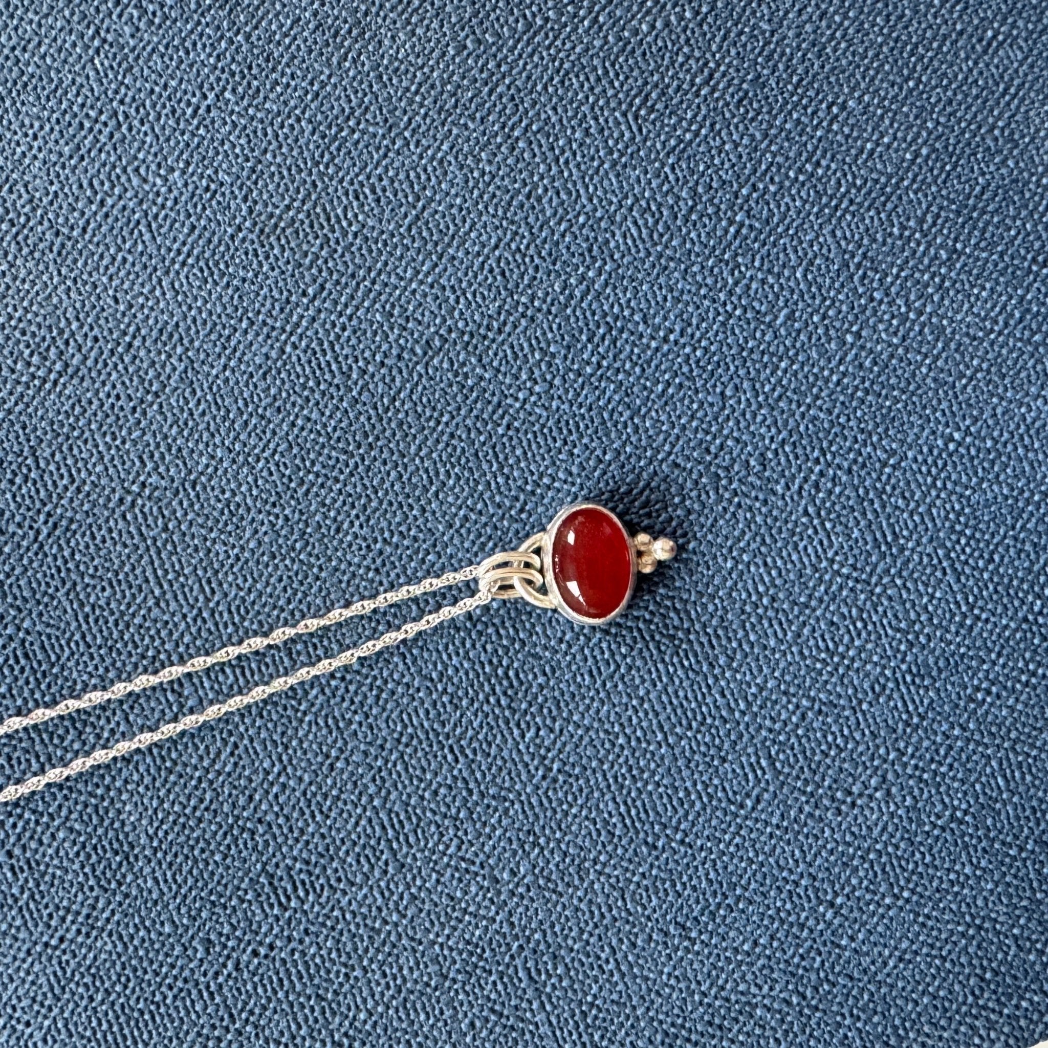 Materials: 14mm x 9mm carnelian cabochon stone set in recycled sterling silver, 18" silver rope chain. Overall pendant size 25mm x 15mm