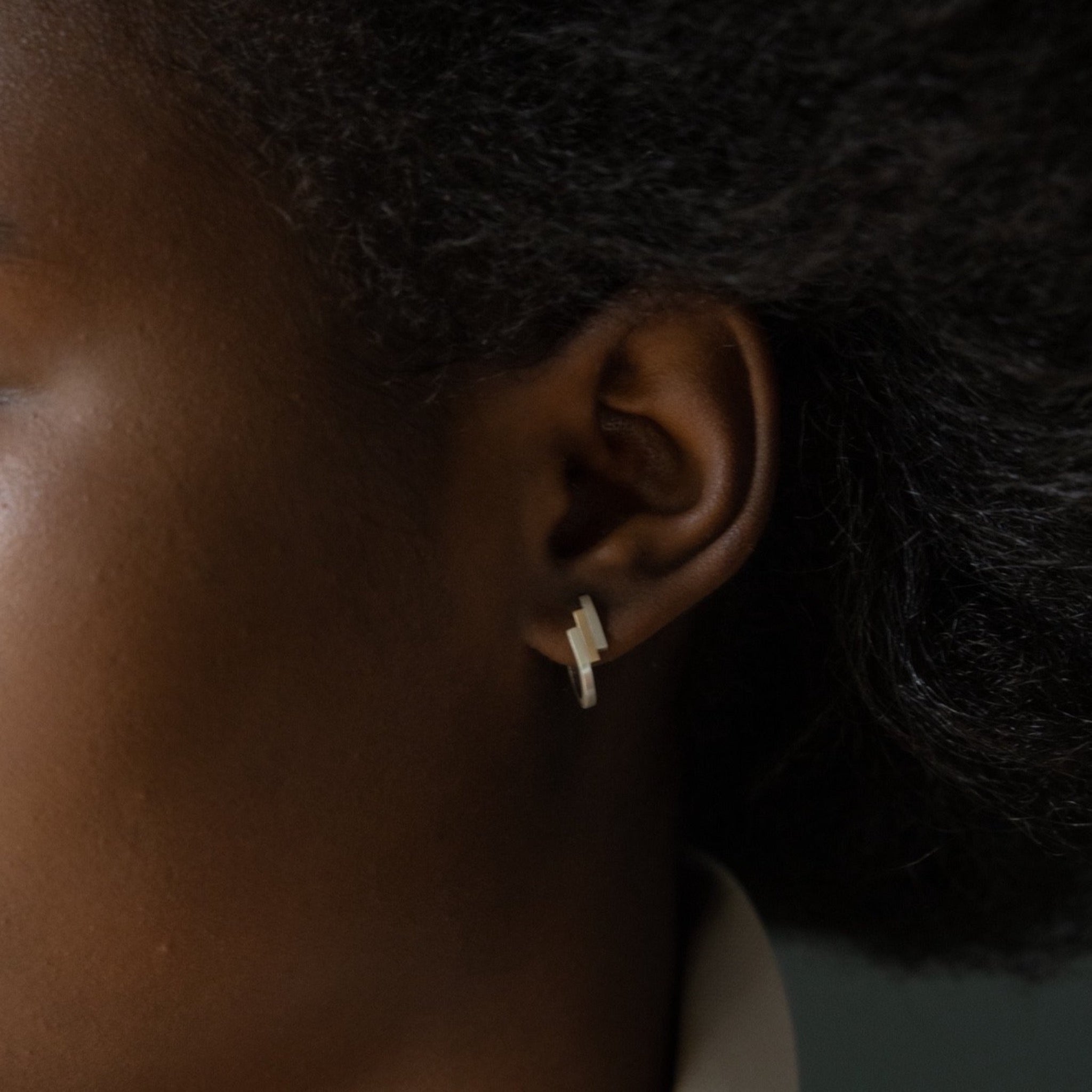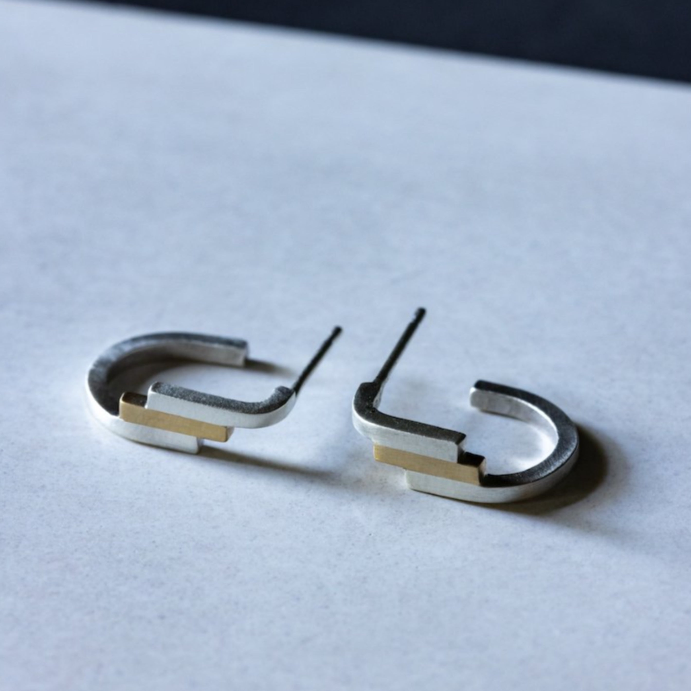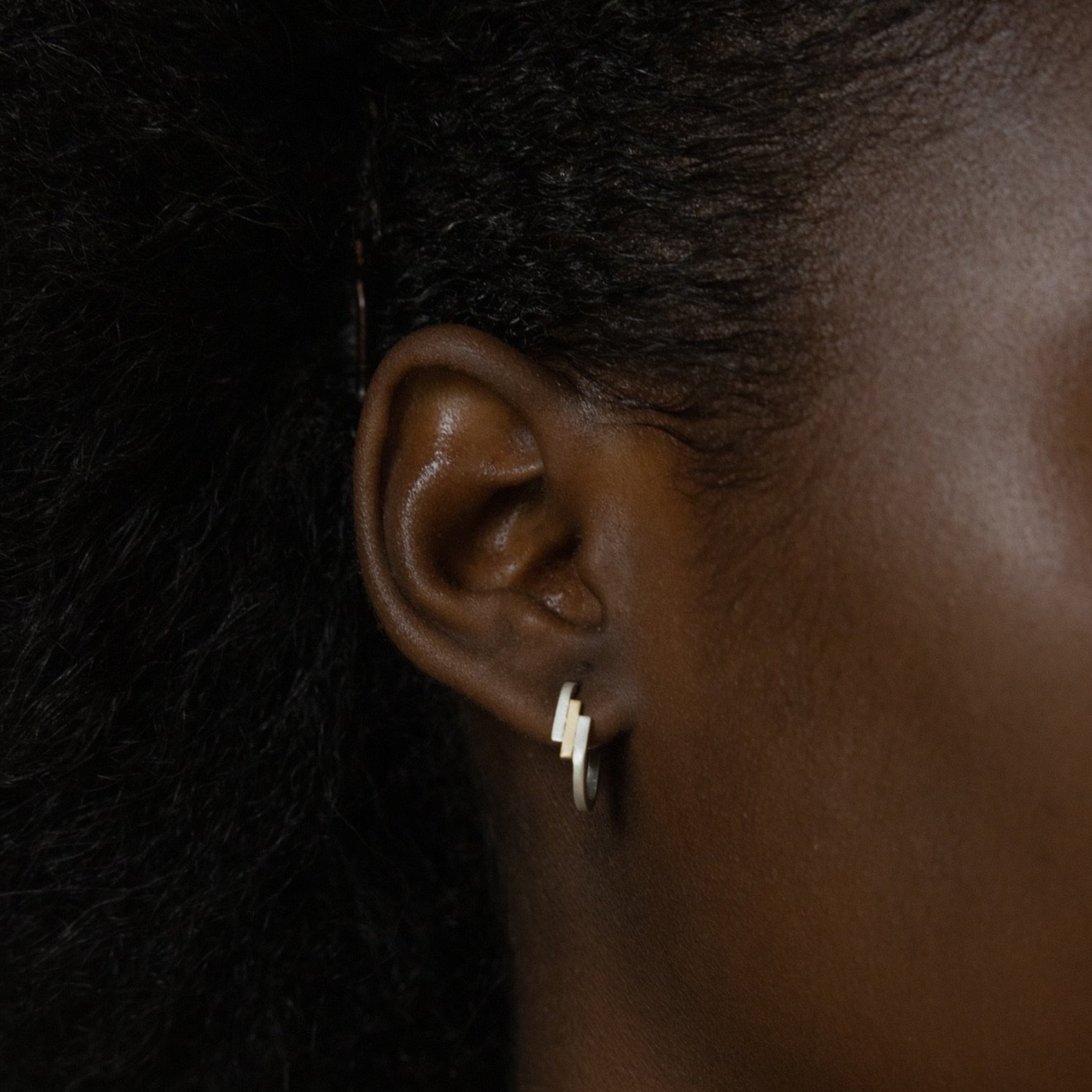 Deconstructed hoops composed of squared gold bars and curves of sterling silver, create the layer earrings. With a nod to an Art Deco style these limited edition earrings are hand crafted by Wild Nora in her Glasgow Studio.