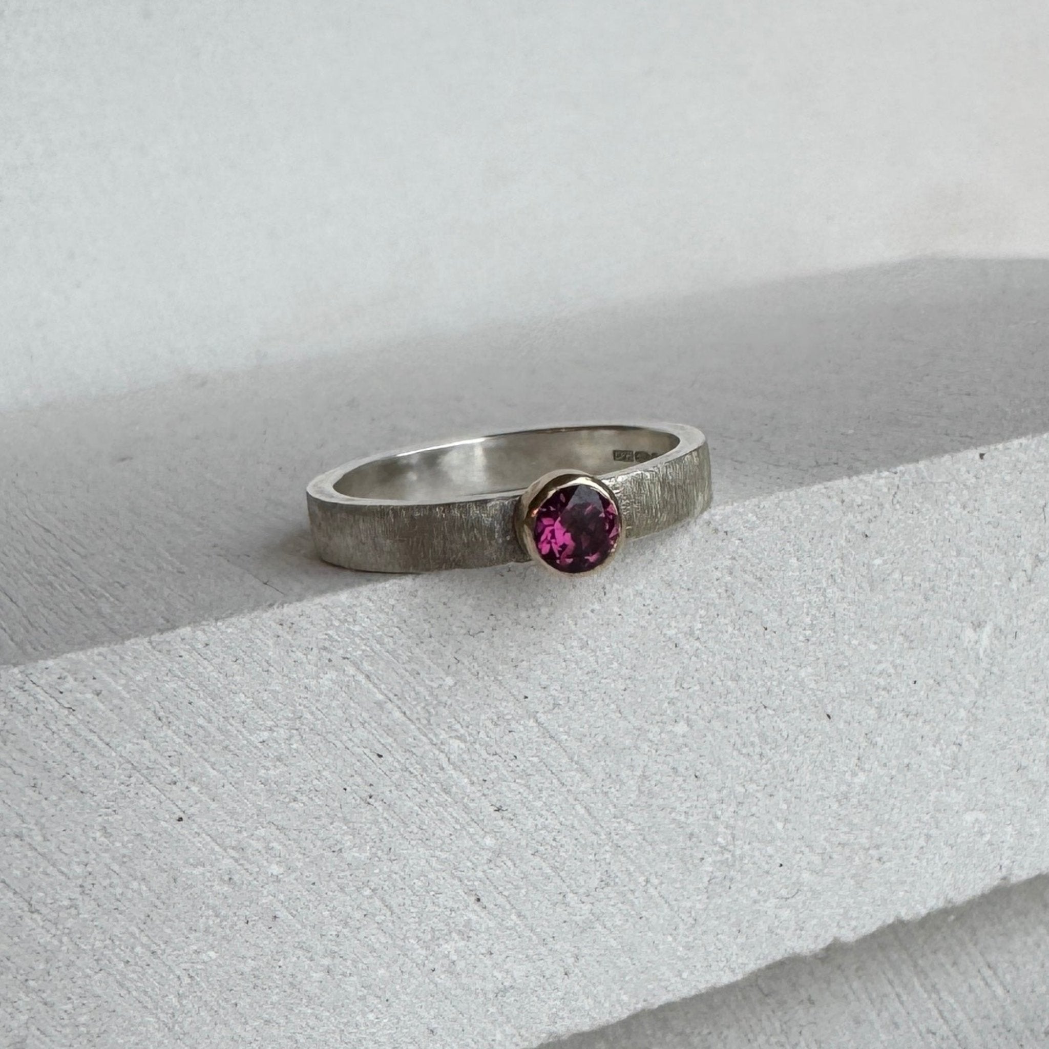 A beautiful sparkly faceted purple pink rhodolite garnet nestles in creamy gold atop a silver band with brushed finish. This playful mix of colours and textures makes for a unique ring.